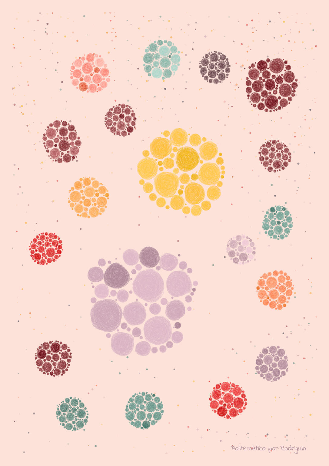 Creada con circle packing y trazos simulados a mano, esta colección hermana de Monotemático multiplica los colores para reflejar la riqueza de lo diverso.